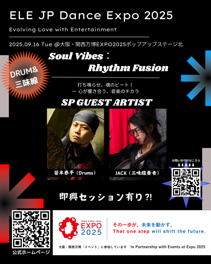 世界中の文化が一堂に会する大阪・関西万博EXPO2025で、音楽とリズムが一体となった特別なセッションが開催されます。世界的なドラム奏者、笹本恭平と、世界を舞台に活躍する三味線の名手、JACKが、独創的な即興音楽を奏で、観客を圧倒します。